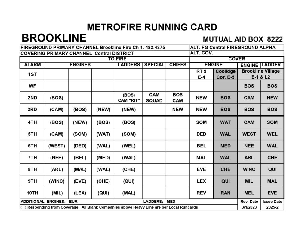 Mailing & Headquarters address 350 Washington St. , Brookline, MA 02445 Station 1 Brookline village 140 Washington St. @ High St.E1, L2, C3 (Shift Commander) Station 4 route 9 Temporarily Closed for Renovations & Cover at Station 6. 827 Boylston St. @ Reservoir Rd.E4, Squad 1, MDU Decon Trailer, Rescue Boat STATION 5 COOLIDGE CORNER 49 Babcock St. near John St.E5, L1 Station 6 Training division & Maintenance Division 962 Hammond St near Horace James CircleE6 STATION 7 WASHINGTON SQUARE 665 Washington St. near Beacon St.E3 BROOKLINE RUNCARD Brookline FD Website Radio Frequency: 483.4375 PL- 131.8