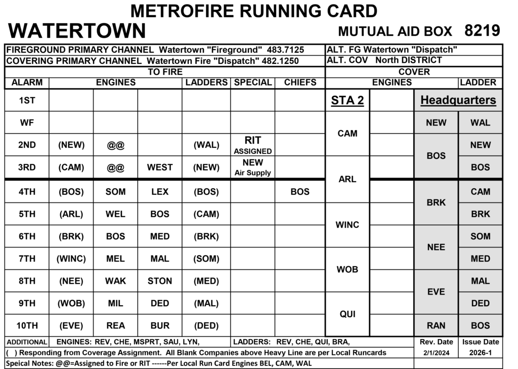 Headquarters Station 99 Main St.E1, L1 Station 2 East Watertown Station 564 Mount Auburn St.E2, L2 Station 3 north Watertown Station 270 Orchard St.E3, Medic 1 WATERTOWN RUNCARD Watertown FD Website Radio Frequency: Disp 482.1250 NAC 131FG 483.7125 PL- 131.8